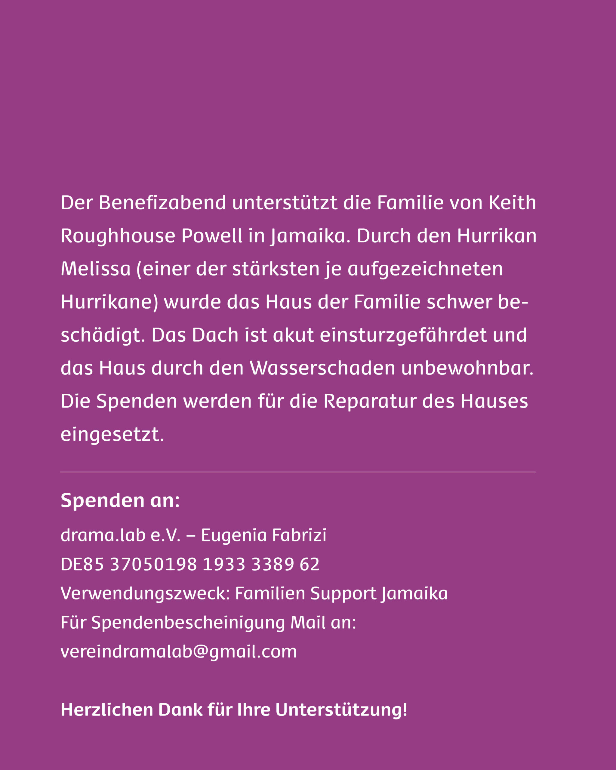Der Benefizabend unterstützt die Familie von Keith Roughhouse Powell in Jamaika. Durch den Hurrikan Melissa (einer der stärksten je aufgezeichneten Hurrikane) wurde das Haus der Familie schwer beschädigt. Das Dach ist akut einsturzgefährdet und das Haus durch den Wasserschaden unbewohnbar. Die Spenden werden für die Reparatur des Hauses eingesetzt.