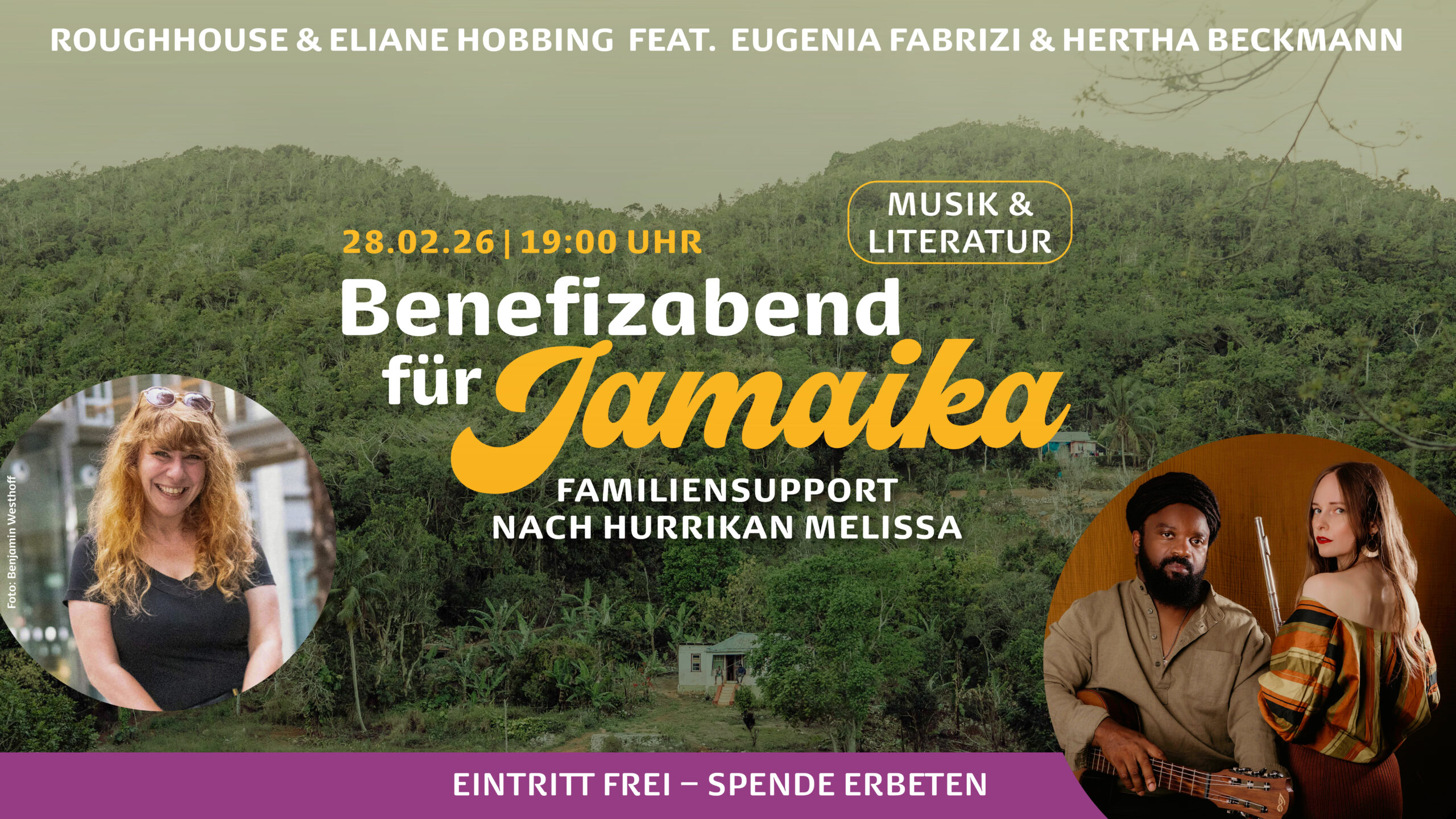 Der Benefizabend unterstützt die Familie von Keith Roughhouse Powell in Jamaika. Durch den Hurrikan Melissa (einer der stärksten je aufgezeichneten Hurrikane) wurde das Haus der Familie schwer beschädigt. Das Dach ist akut einsturzgefährdet und das Haus durch den Wasserschaden unbewohnbar. Die Spenden werden für die Reparatur des Hauses eingesetzt.