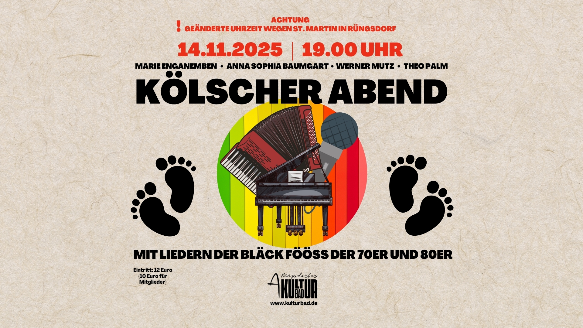 Drink un sing doch ene mit … in unserem Veedel – beim Kölschen Abend am 7. November 2025 um 19.00 Uhr im Rüngsdorfer KulturBad! Marie Enganemben, Anna Baumgart, Werner Mutz und Theo Palm sorgen mit Liedern der BLÄCK FÖÖSS aus den 70ern und 80ern für beste Stimmung und gute Laune.