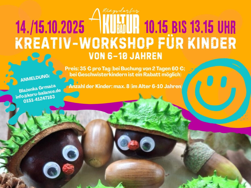 In diesem 3-stündigen Workshop entdecken die Kinder, wie viele Schätze die Natur bereithält. Gemeinsam gestalten wir lustige Kastanien- und Eichelfiguren, zeichnen Blättermuster auf Holz, verzieren Schatzkisten mit getrockneten Blättern und Kräutern, arbeiten mit Wolle und Filz und probieren noch viele weitere kreative Ideen aus.